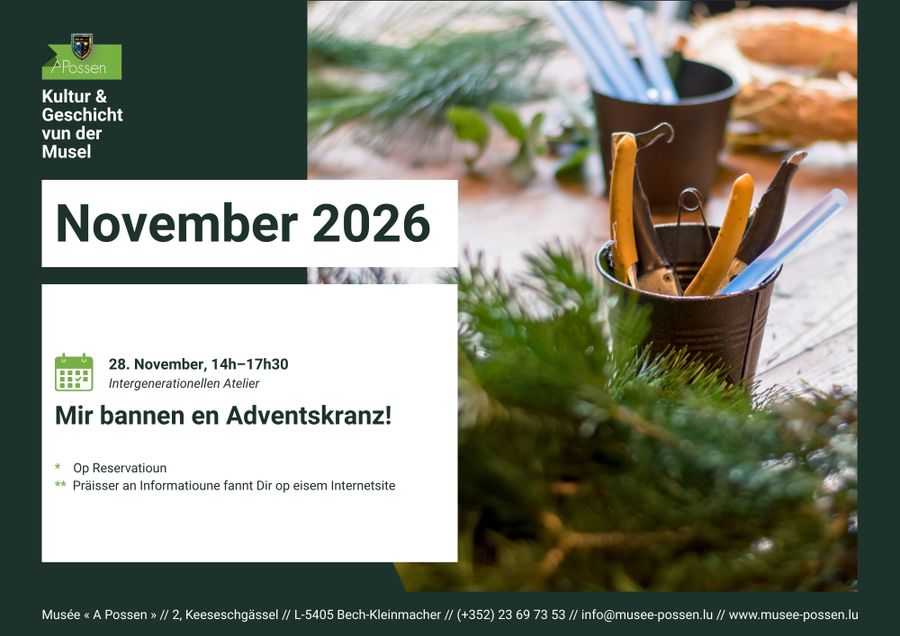 Reservation required by phone at +352 23 69 73 53 or via e-mail at info@musee-possen.lu