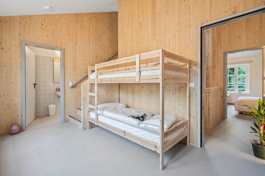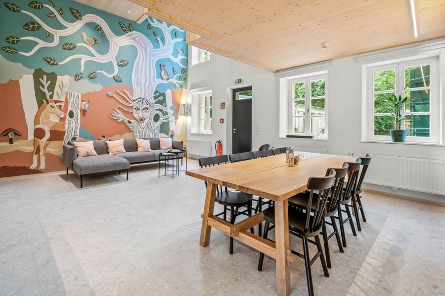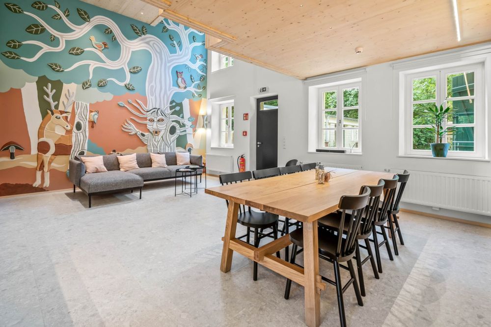 De nieuwe binnenwanden en plafonds bestaan uit onbehandelde massief houten elementen. Alle voorgestelde bouwmaterialen zijn hernieuwbare grondstoffen, die door hun verwerking en mechanische bevestiging ook eenvoudig hergebruikt kunnen worden.