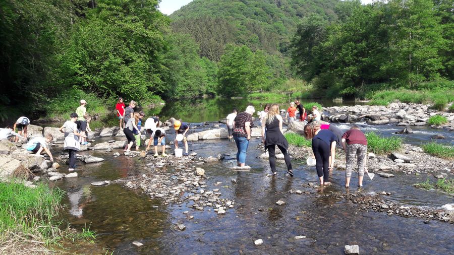 Afhankelijk van het weer en de samenstelling van de groep begint het avontuur direct in de rivier. Met hun eigen rubberlaarzen of bij warm en droog weer op blote voeten verkennen de kinderen samen het water en ontdekken ze kleine waterdieren, zoals insectenlarven of beekvlooien. De dieren worden voorzichtig verzameld en daarna van dichtbij bekeken in het waterbeleveniscentrum, met behulp van loepen of microscopen. Er is voldoende tijd om te observeren, zich te verwonderen en vragen te stellen.