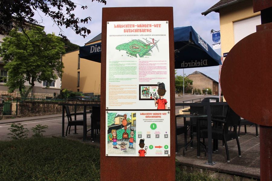 Het startpunt van de audio- en wandelroute is op het Gymnichplein in de woonwijk Budersberg. De finish is op de Johannisberg (Mont St. Jean). De route passeert 10 stations en gaat voornamelijk door het bos. Bij elk station staat een bord met 5 verschillende QR-codes. U kunt kiezen uit vier verschillende talen: Luxemburgs, Frans, Duits of gebarentaal (met behulp van het advies voor slechthorenden SmH). De wandelaar kan het verhaal beluisteren of bekijken op zijn smartphone. De 5e code wijst de weg naar het volgende station.