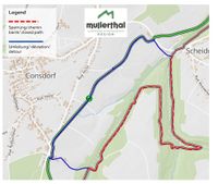 Het startpunt van deze rondwandeling is het voormalige treinstation Op der Gare aan het einde van de Route de Luxembourg in Consdorf. Hier herinnert een aan de rand van het dorp opgegraven en onschadelijk gemaakte bom aan de verschrikkingen van de Tweede Wereldoorlog. Eerst gaat het pad over een asfaltweg naar het romantische Dielchen, dan gaat het verder door een schaduwrijk gemengd bos langs de Dachselee (rots van de das), genoemd naar een door dassen aangelegde dassenburcht. De vallei van Ponteschgrënnchen wordt bereikt via een reeks trappen en het pad leidt naar het dorp Scheidgen, langs de Roude-Léiw-Fiels, een patriottische plek ter herdenking van de honderdste verjaardag van de onafhankelijkheid van het Groothertogdom in 1939. In Ponteschgronn memoreert een plaquette de toerismepionier Fred Welter (1921-1973) uit het dorp Scheidgen. Het wandelpad gaat verder via het fietspad Echternach-Luxemburg naar het centrum van het dorp Consdorf en brengt de wandelaars, na gedeeltelijk het dorp over pittoreske paden te hebben overgestoken, terug naar het startpunt, waar een mededelingenbord informatie geeft over de Charly smal- spoorlijn, die van 1904 tot 1954 in bedrijf was.