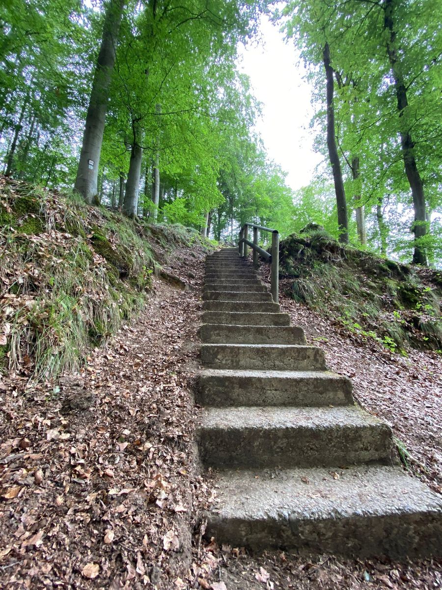 Vanaf het begin bij de Tourist Info leidt het pad naar de Gudelterhaff en verder naar de Noumerleeën. Deze indrukwekkende rotsformaties zijn kenmerkend van de Luxemburgse zandsteen uit de regio en tonen veel verschillende geologische structuren. De overblijfselen van een vluchtburcht, de Alebuerg, zijn hier te vinden, evenals sporen van houtverkolingsplekken.  Vervolgens gaat het pad door het bos, de Knappbësch, langs een kapel naar de Heisgeskräiz, waarschijnlijk het oudste wegkruis in Luxemburg. Niet ver van het kasteel gaat de weg terug naar het startpunt.