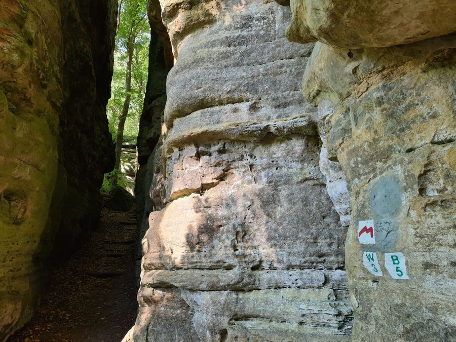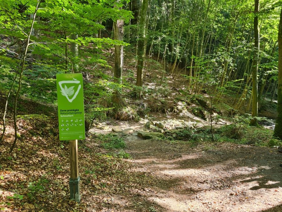 De route begint in Müllerthal bij het Touristcenter Heringer Millen. Door het bos leidt de wandeling in de richting van Berdorf over pittoreske hellingen en langs prachtige rotsen. De smalle doorgangen in de torenhoge rotswanden rond de Werschrummschlëff wachten erop om ontdekt te worden. Onmiddellijk daarna bereikt men de Predigtstuhl, een torenhoge rotsformatie die half over de straatweg naar Berdorf hangt. Op treden die in de rotsen zijn gehouwen, en via de labyrintische gangen, kan men de predikstoel beklimmen en van het uitzicht genieten. De terugweg voert door het koele dal van de zwarte Ernz terug naar het dorp Mullerthal.