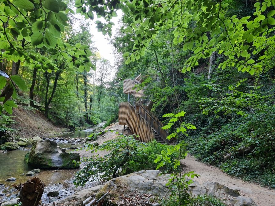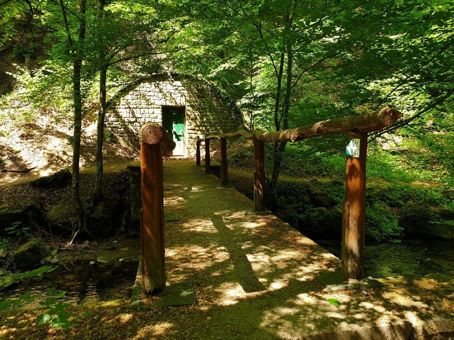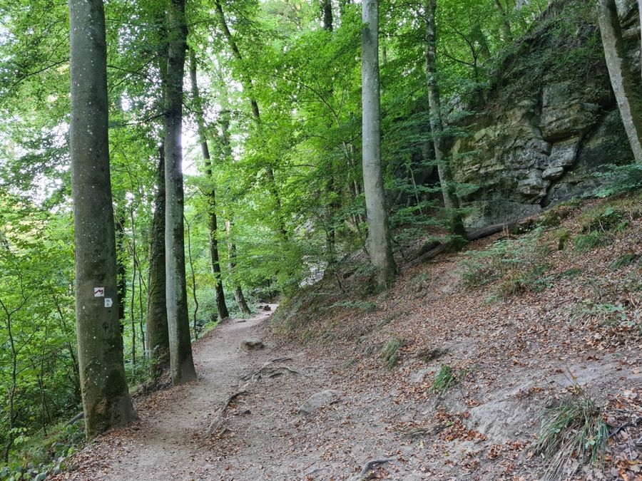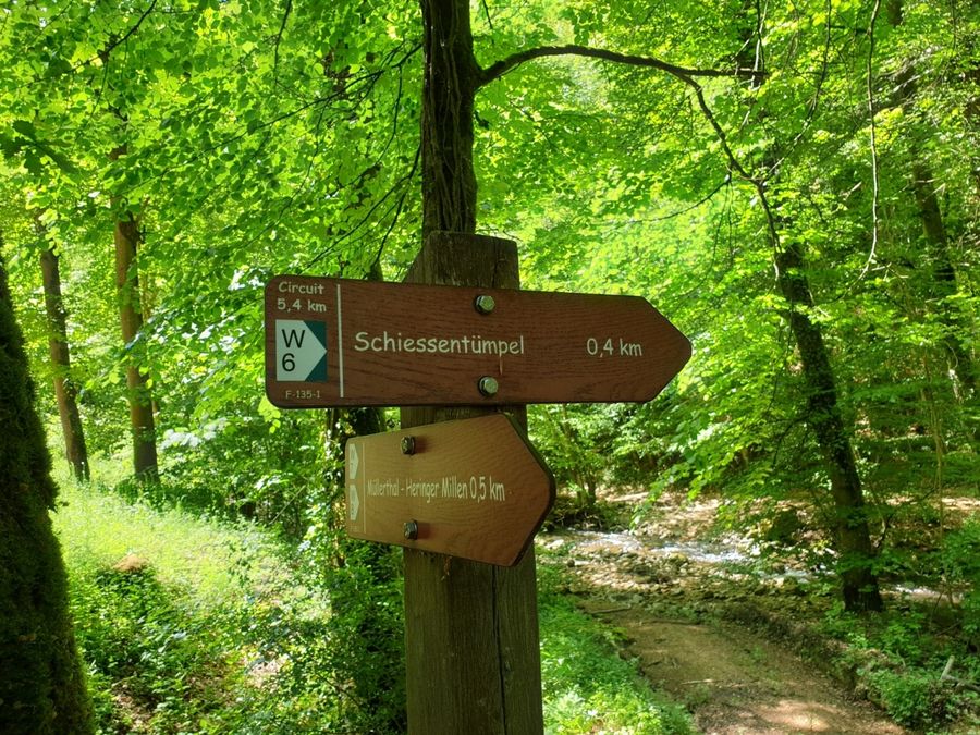 Dit wandelpad brengt u naar het symbool van de regio Mullerthal - Klein Zwitserland van Luxemburg: de Schiessentümpel. Het is de meest populaire excursiebestemming in de regio en kan het beste te voet worden bereikt. Achter de Schiessentümpel staat een moderne trappenconstructie, die is gebouwd om de Schiessentümpel na de zware stormen van 2018 weer toegankelijk te maken.