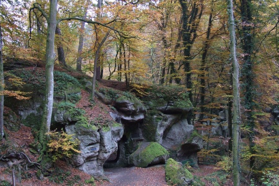 Volg de Mullerthal Trail verder door het betoverende rotslandschap naar de “Huel Lee”, een door mensen gemaakte grot. Een informatiebord geeft informatie over het ontstaan ervan.