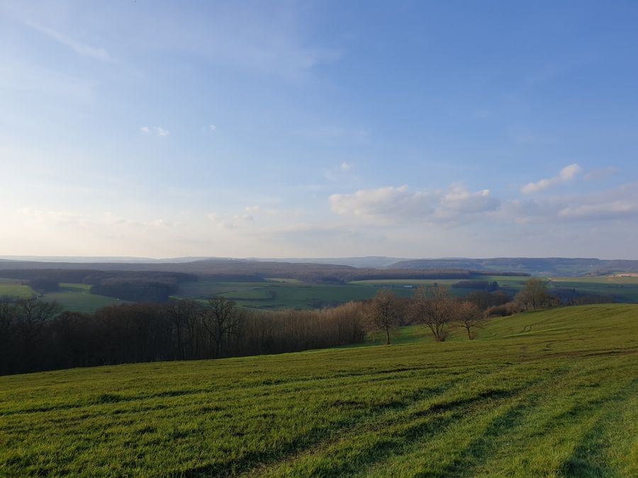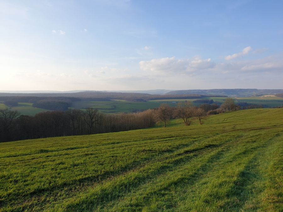 Dit pad, dat begint met een lichte klim door de velden, leidt je langs de heuvels tot je Op der Bëlz bereikt, voordat je terugkeert naar het startpunt voorbij de Neimillen.