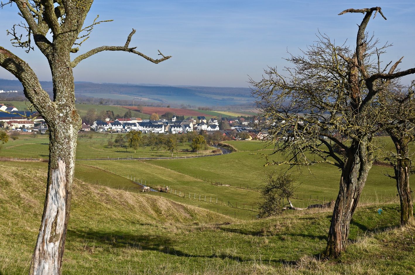 Uitgebreide wandeling rond het dorpscentrum. We lopen eerst door het dorp en dan langs de weg en de vallei van de Fluessweilerbaach. Kort voor Berg slaan we rechtsaf het bos in, waar we doorheen lopen naar de zuidoostelijke ingang van Flaxweiler. Van daaruit slaan we af in de richting van Widdebierg. We lopen langs de beboste hellingen en over velden terug naar het startpunt.