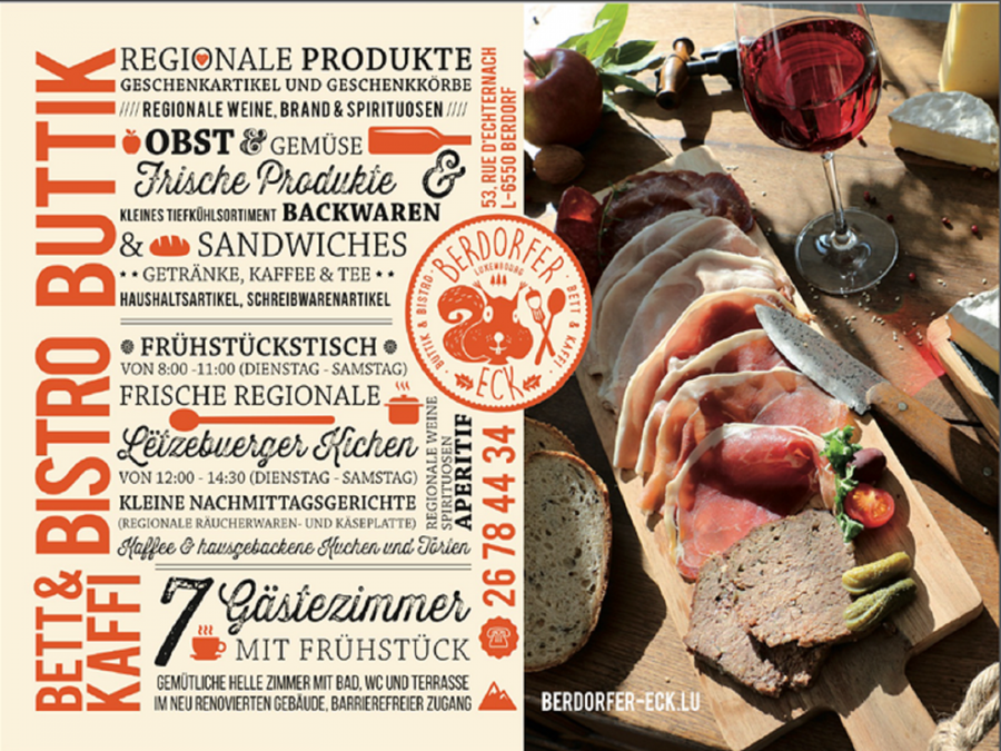 Berdorfer Eck offers regional, Luxembourgian, fair-trade, organic products and basic products for the household in the shop. In addition, there are individually presented gift baskets as well as a good selection of gift items.