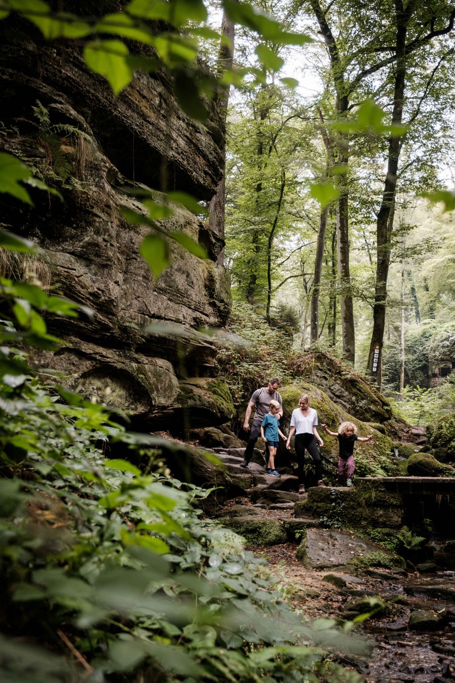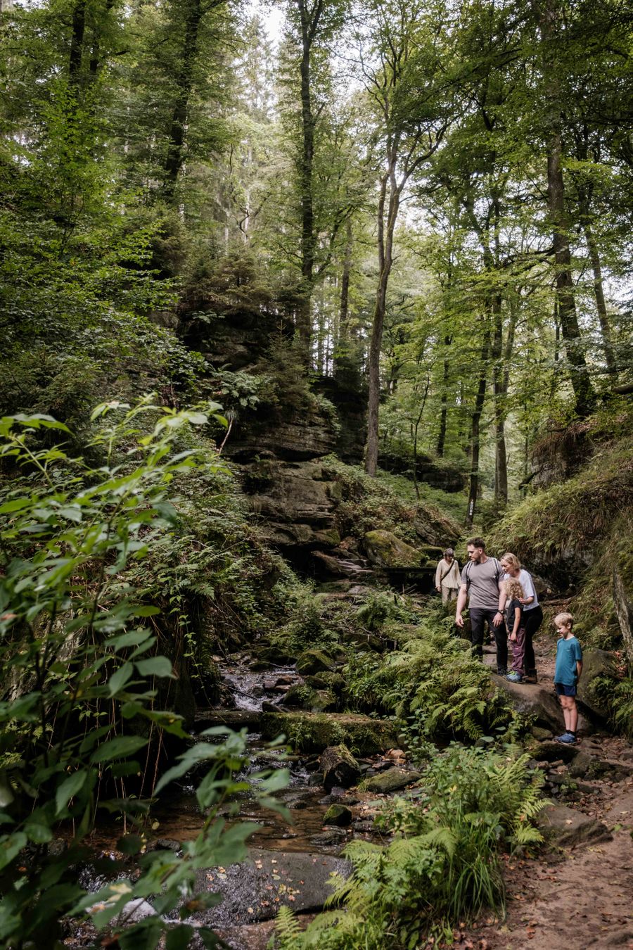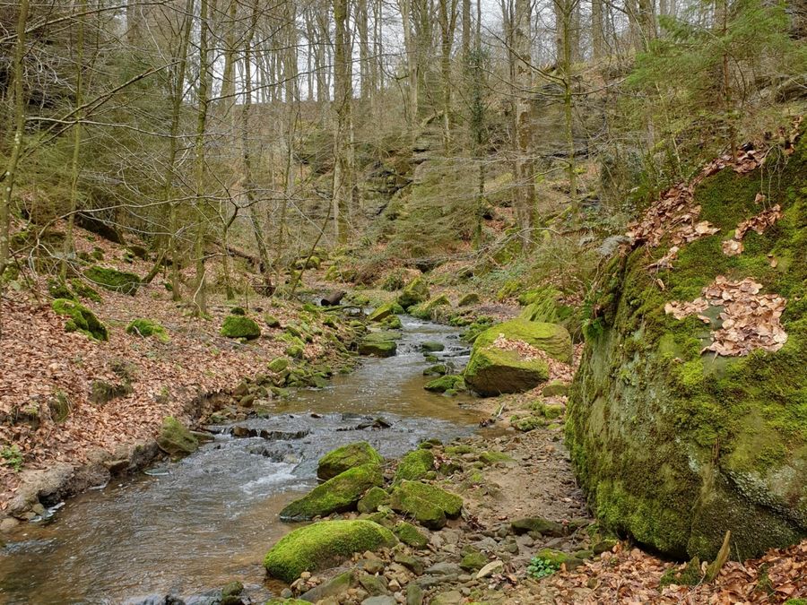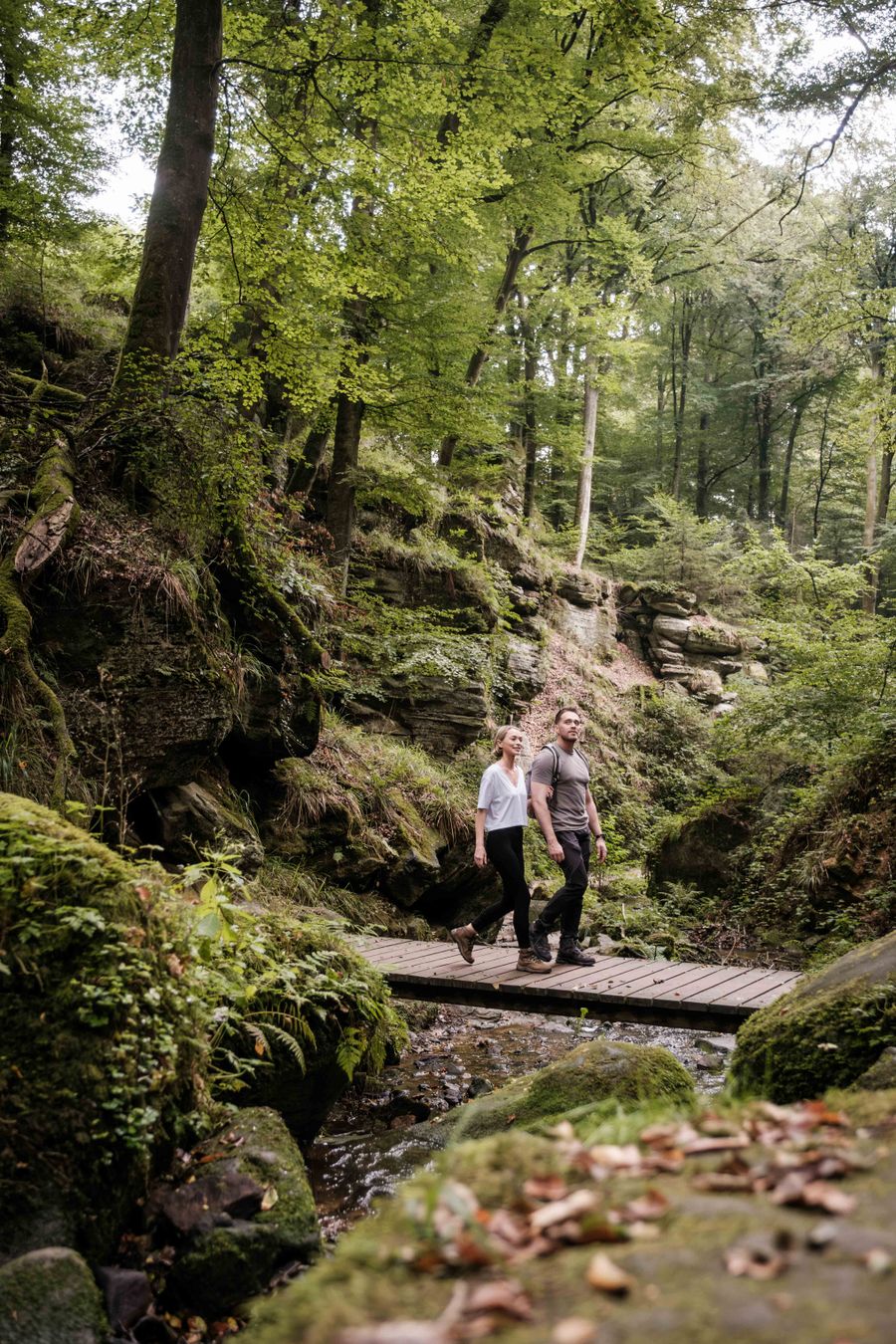 A hike along the wild-romantic, bubbling streams Haupeschbaach and Halerbaach leads through typical V-shaped valleys. This form is created by the weathering of the rock walls. The weathered material falling from the rock faces covers the foot of the steep cliffs of sandstone with sandy and stony debris. Numerous springs emerge from the sandstone and feed the streams, so that the landscape is characerised by the water. Therefore, even on hot summer days it is pleasantly cool in the valley. Hikers can enjoy many small wooden bridges that cross the stream and a unique landscape of mossy rocks.