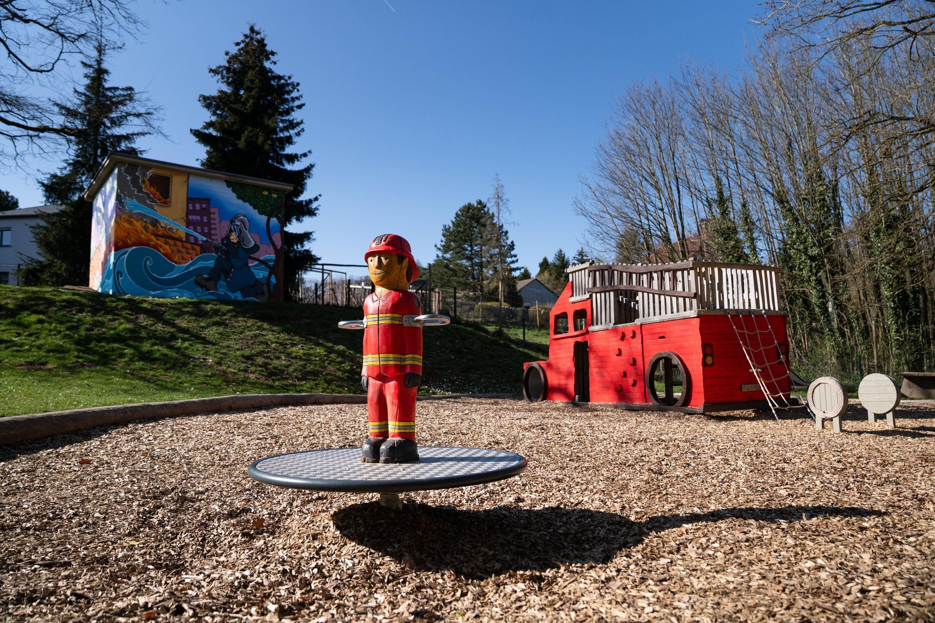 This playground is quite hidden, built in a purely residential area, it is a “secret” that deserves to be revealed. The dominant colour of this playground is of course red and there is even beautiful graffiti in the theme. The big trees graciously offer their shade. The wooden structures and the big slide are very inviting.