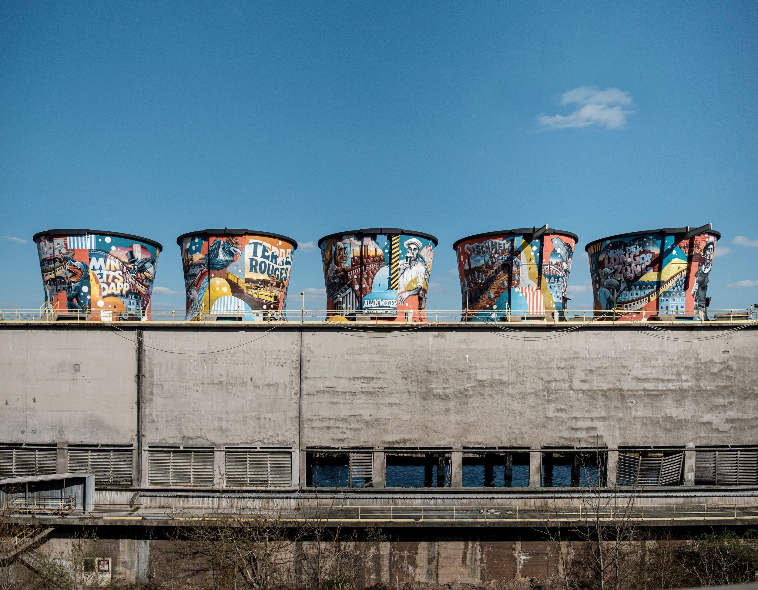 The “old cooling towers” in Differdange are five cooling towers from the former Arcelor steelworks, which were colourfully painted in 2020 by street artist Alain Welter as part of the “Art in the Loop” project to save them from demolition. One of these towers, the Hadir Tower, had already been demolished in 2014. The artwork was intended to showcase the industrial heritage and culture of the location.
