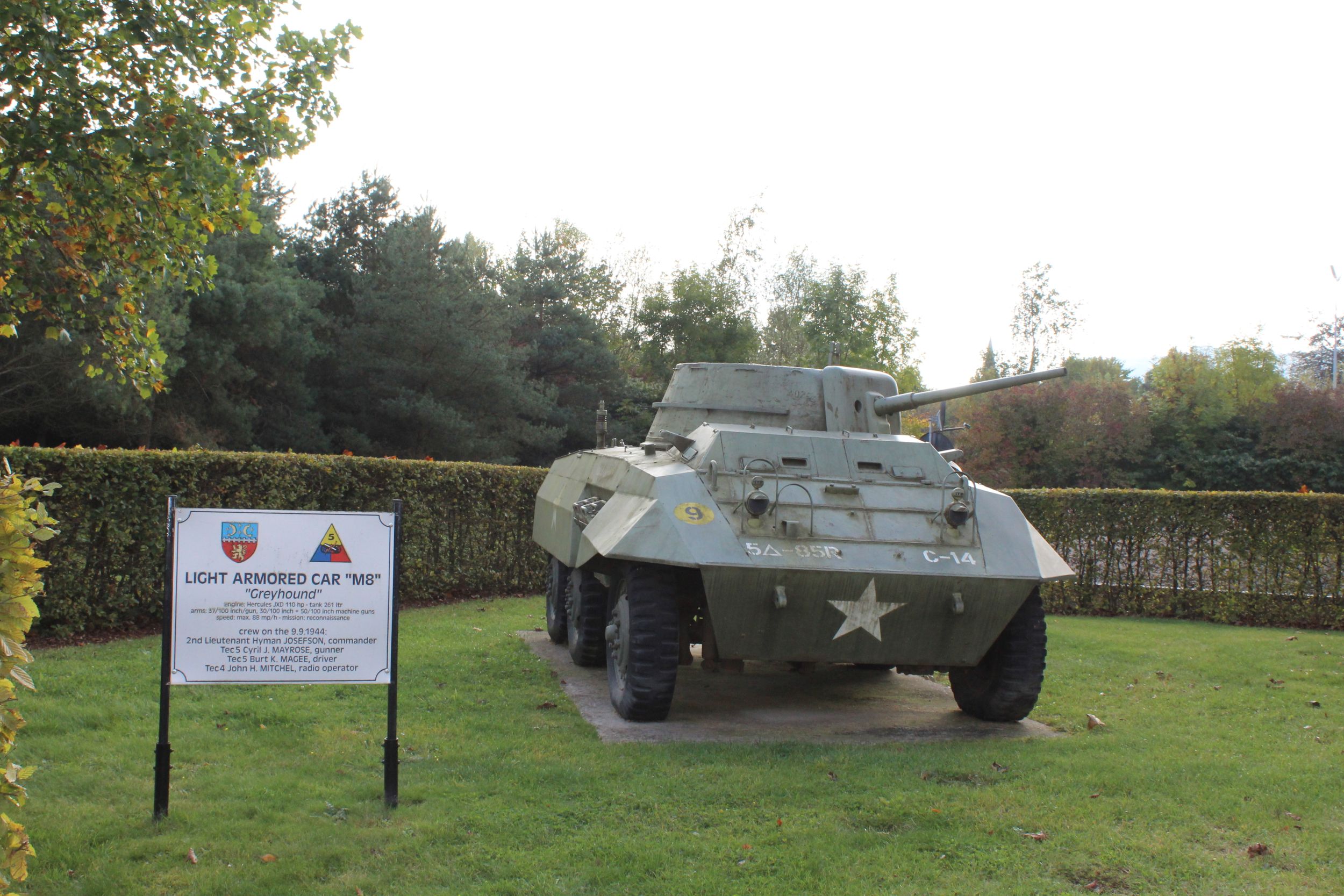 The memorial consists of a stone pedestrial with engraved American Eagle and has an adjacent enamel signpost with the inscription “Square 2nd Lt. Hyman Josefson, First American Soldier KIA for the Liberation of Pétange and the Grand-Duchy of Luxembourg, September 9, 1944”. In addition, an M-8 Greyhound armored reconnaissance car, as used by Josefson and his crew has been added almost on the exact site where 2nd Lt. Josefson died, when his “Greyhound” was hit by a German anti tank gun at the former “Wax” mill.