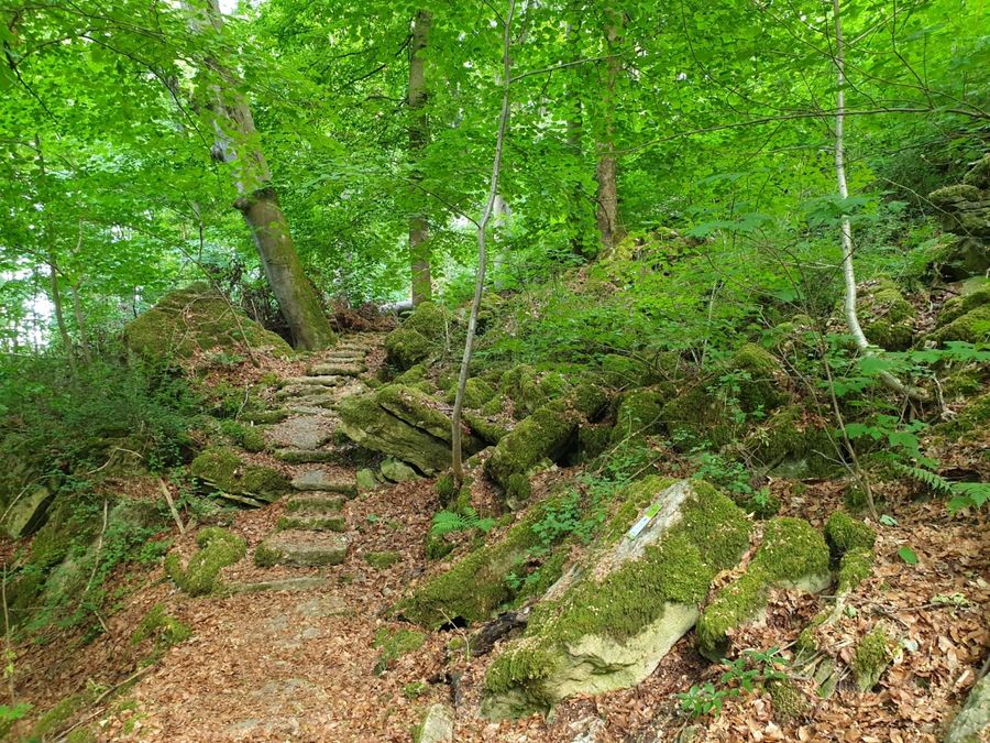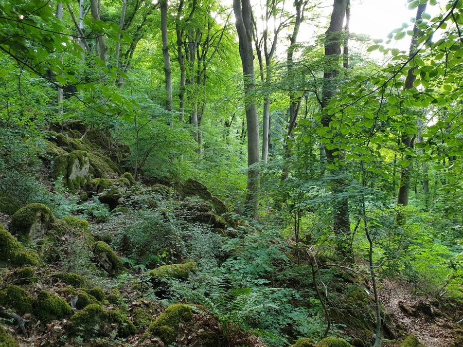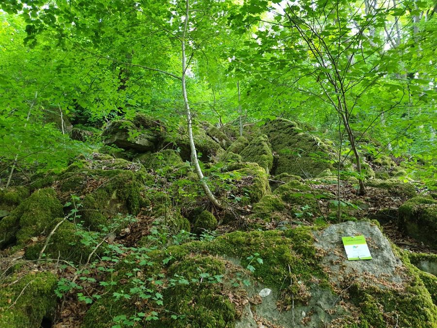 Covered with moss, lichens and ferns, the "Gefale Leeën" - "fallen rocks" - line the path. The rocks are made of dolomite and have fallen from the great rock face. Water trickles through crevices in the dolomite and accumulates on the underlying marls, a clay-rich rock. For a long time, the rock faces of the dolomite slip down on the softened marls to the valley. Huge rock falls such as the "Gefale Leeën" can occur on the Dolomite rock walls, but they are rare. They are usually favoured by intense erosion of the slope by the Sûre. On the unsteady relief around the partially overgrown stone blocks, a canyon forest has developed. A canyon forest of linden, maple, beech and elm trees grows on steep slopes where the top layer of soil and rock is not stable.