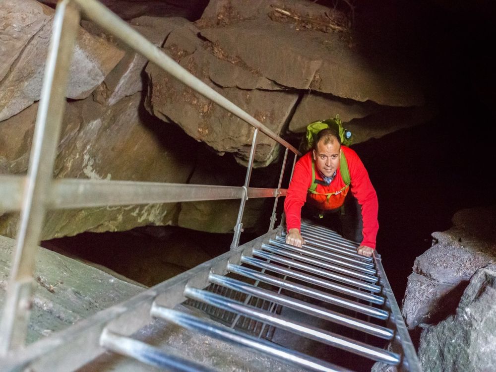 Enter one of the narrowest caves in the region and climb out again via the stairs.