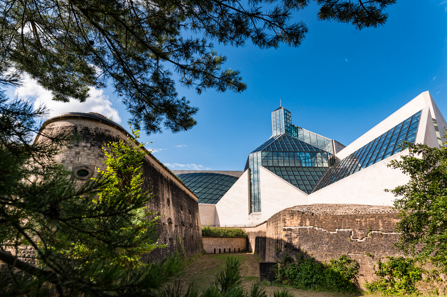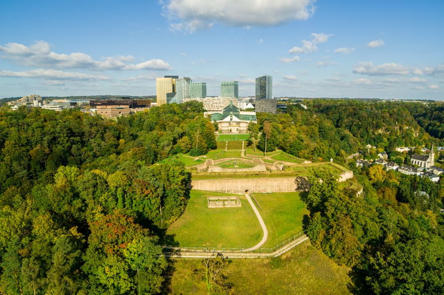 The Three Acorns Park (Parc des Trois Glands) in the Kirchberg business district, stretches behind the Philharmonie, the Mudam Museum of Modern Art and Fort Thüngen. The site, which has been redeveloped by landscape architect Michel Desvigne and offers a panoramic view over the old town, combines modernity and history, valley and high plateau, low medieval buildings and the multi-storey towers of a modern metropolis. Visitors can learn about Luxembourg’s past as a fortified city and enjoy breathtaking views of the capital.
