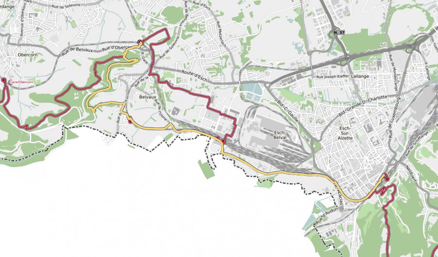 The route offers views of the former industrial area Esch-Belval, once the center of Luxembourg's steel production. Today, Belval is a new business and service center, also hosting Luxembourg's university. The associated state-of-the-art Belval-Université station is reached after the first 3.5 km of this hike. In the final section, from around Belval-Rédange station, the path rises by about 100m. The latter station is close to the French border. It serves the towns Belvaux (L) and Rédange (F). This hike ends at Belvaux-Soleuvre station.
