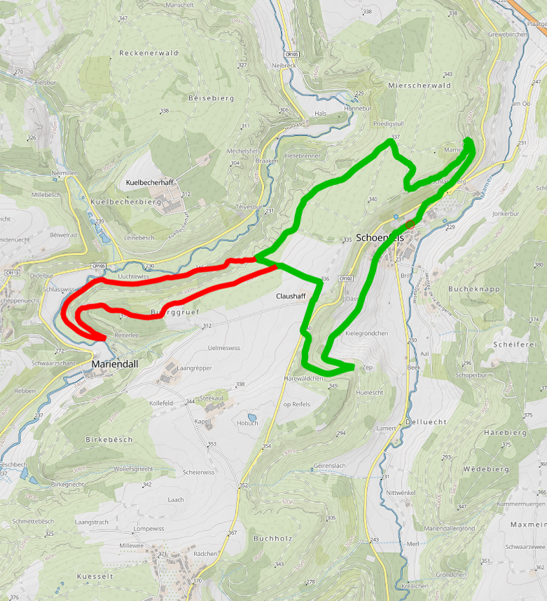 This hilly trail links the valley of the Mamer to that to the Eisch by passing near Claushaff and skirting the Buerggruef. It crosses the magnificent forest of Mierscherwald. Highlights of this circular route are the Mammerleen Caves, an area of natural sandstone caves and a network of man-made tunnels, and Schoenfels Castle at the trailhead. While the Auto-pédestre circular walks can be discovered in both directions, the recommended direction for this trail is clockwise.