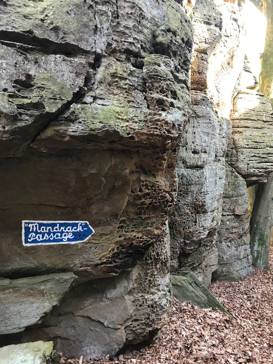Surrounded by pretty pine forest, you enjoy a nice view of the Sauer valley at a viewpoint, which you reach via a ladder. The highlight of the route is certainly the Mandrack Passage, a rock formation and narrow crevice named after the German TV presenter Manuel Andrack. A little further is the distinctive Kalekapp rock, then follows the Rammelee.