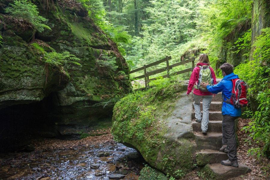 The hiking trail leads through forests and along the romantically wild streams Haupeschbaach and Halerbaach, offering different perspectives in every season. The path starts at Beaufort Castle and passes by Klingelbur, an old washing fountain. The old refuge castle Alebuerg is also passed. After crossing a nature reserve (Elteschmuer), there is a beautiful view from Grevenhaff. Along spectacular rocks such as the Ellerlee, the hiking trail winds back to the starting point.