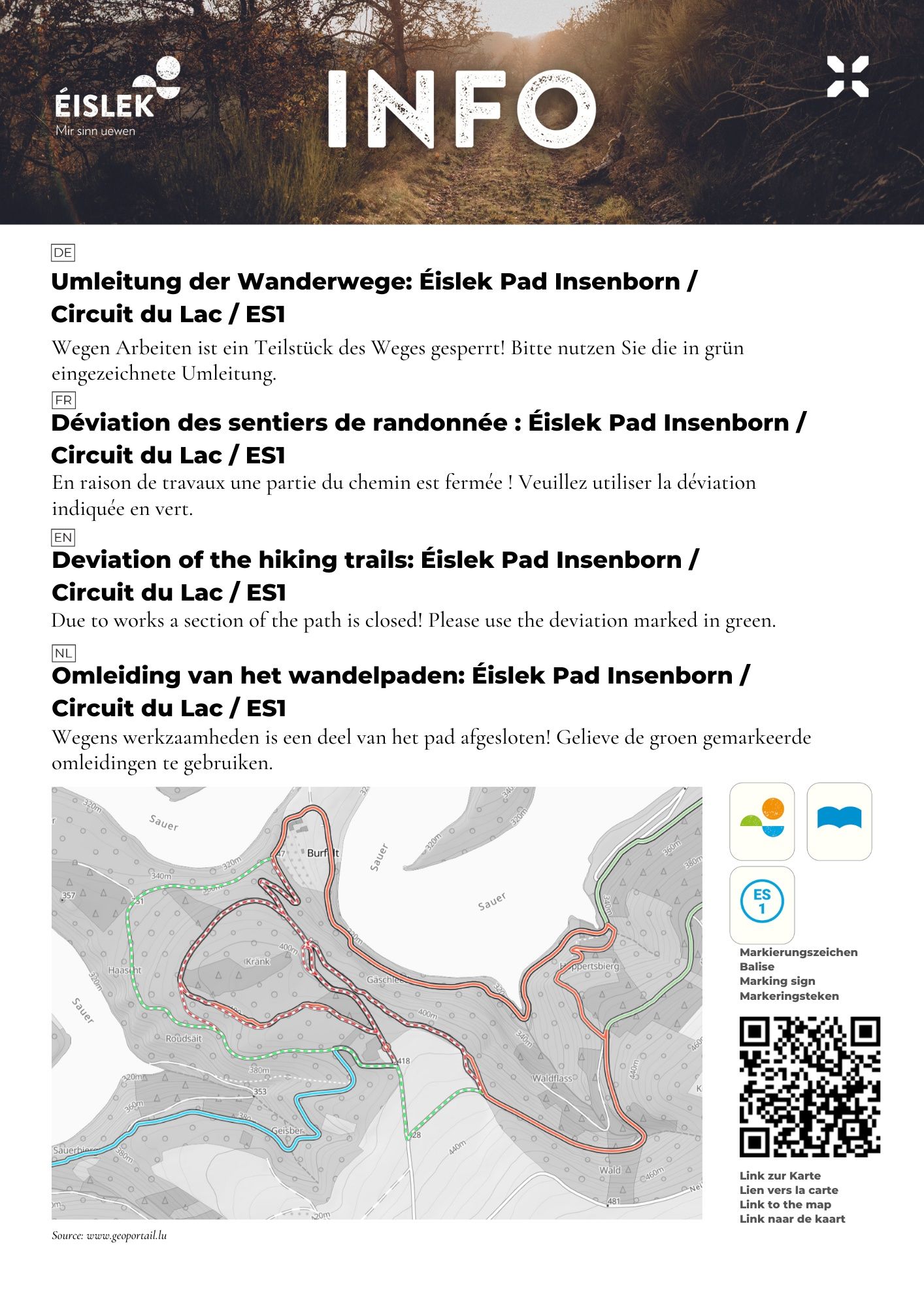 The hiking trail is marked in both directions. Please follow the white-blue "ES 1" markings.
