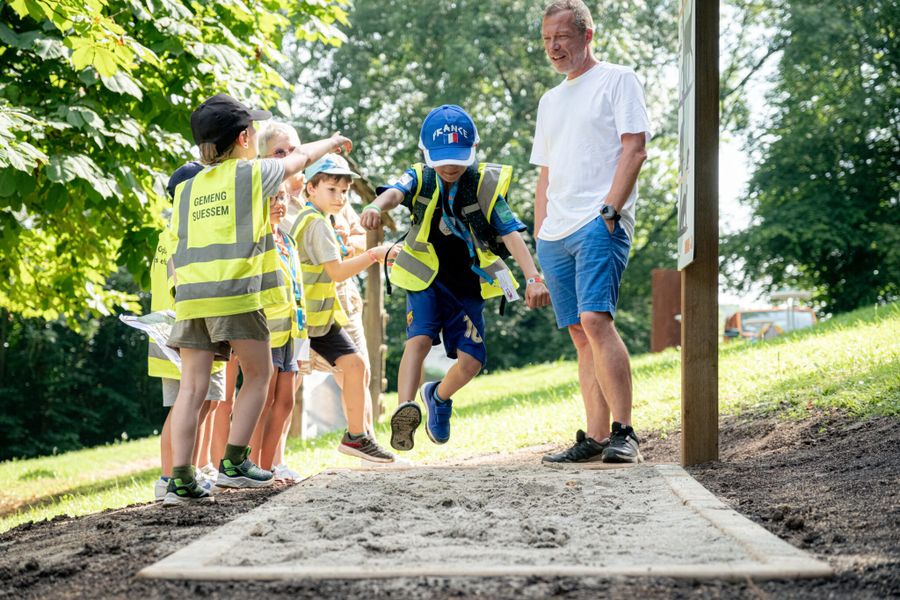 For example, they learn about the different tree species and their roots as well as the most important bird species in the region, which differ not only by their songs but also by the exact timing of their songs before dawn. In addition, visitors can compete against animals in long jump, listen to the whispering of the forest, and take a journey back in time to the era of the "Buurg Zolwer".